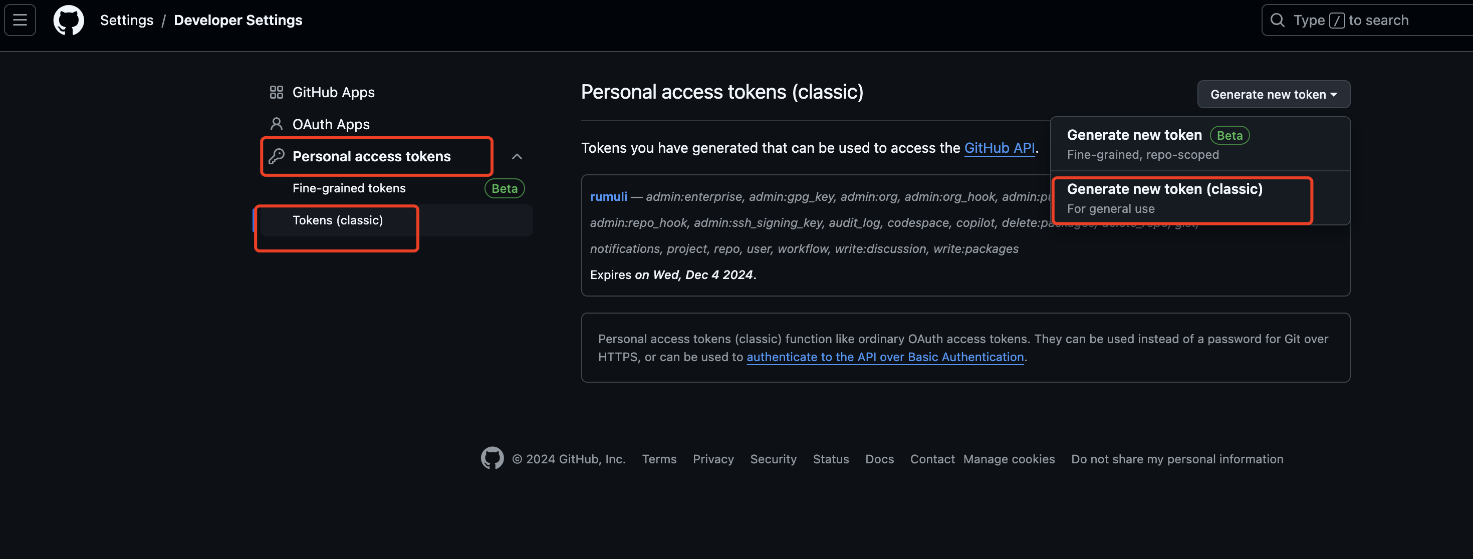 然后鼠标点击右上角个人头像,进入settings选项,配置完你的主要邮箱后,选择Developer settings配置令牌,当然ssh密钥这些也是要配的,只不过暂时不需要,后面你们会知道干嘛用的。