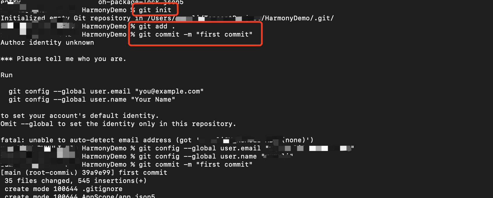 现在,使用命令行切换到本地需要上传的项目的目录下,我这里项目名为HarmonyDemo,在这个目录下键入git init,使用命令初始化一个新的Git仓库。