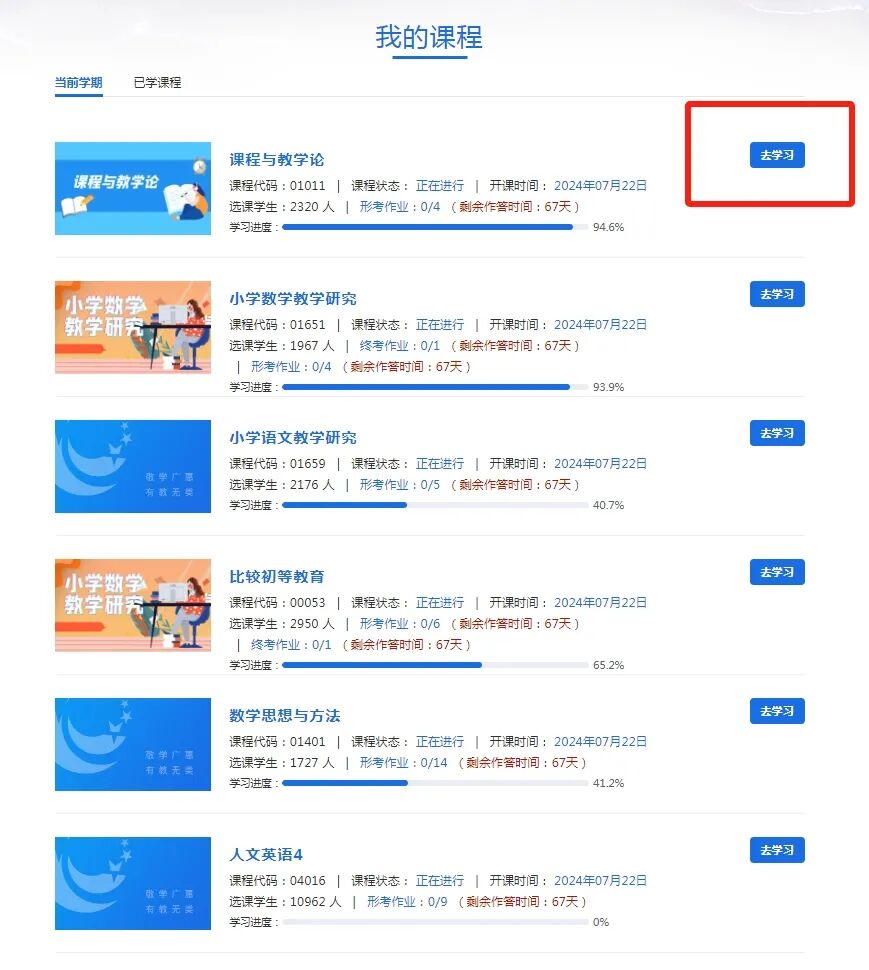 “当前学期”课程均需要在“剩余作答时间”内学习完毕。
