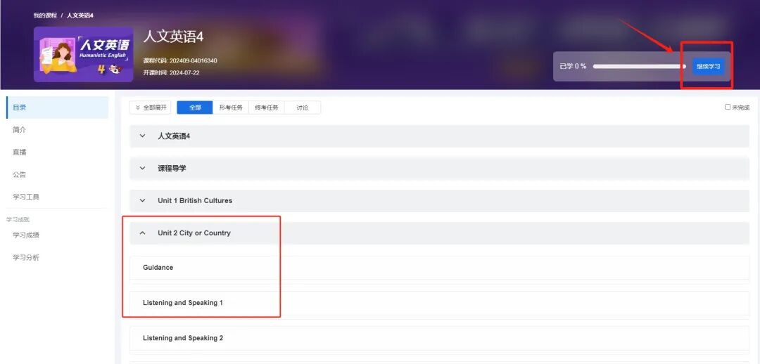 也可按照个人意愿在下方点击每单元折叠箭头,选择单元进行学习。但所有内容都需学习完毕。