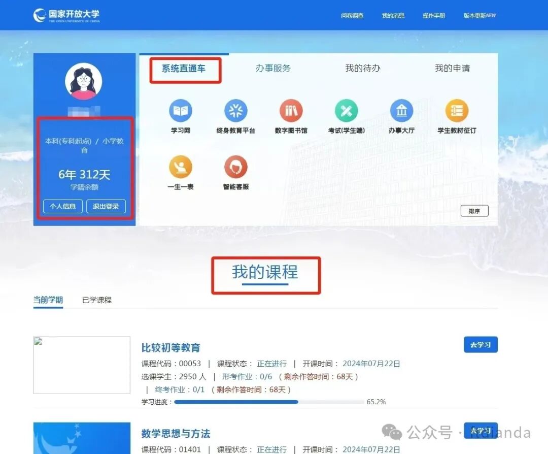 个人空间左上方显示个人信息包括姓名、所属学习中心、专业层次及专业、学籍余额。右上方显示导航栏,使用最多的为“系统直通车”,可快速跳转至学习网、考试端和数字图书馆等。