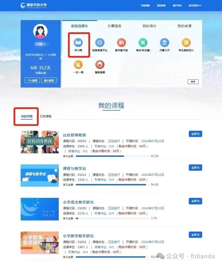 下方为“我的课程”,包括当前学期课程和已学课程,课程显示课程名称、课程代码、开课时间、形考任务数量、剩余作答实践和学习进度等。