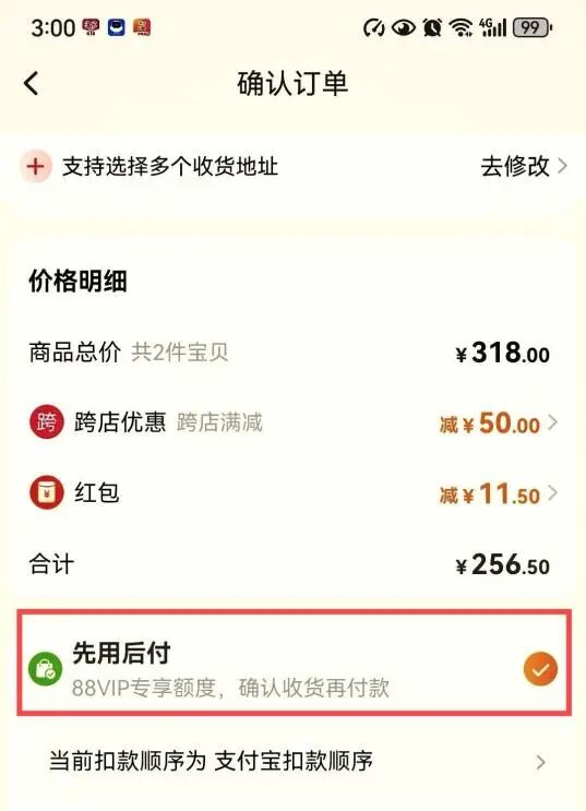 细心的消费者通过反复琢磨,终于找到了踪迹。以某平台为例,原来,在购物车结算页面的下拉选项中,有一个已经被自动勾选的“先用后付”功能。消费者不需要额外确认或输入密码,就可以下单。