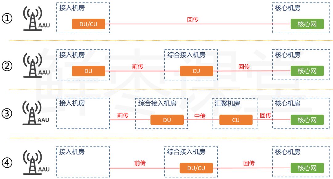 依据5G提出的标准,CU、DU、AAU可以采取分离或合设的方式,所以,会出现多种网络部署形态: