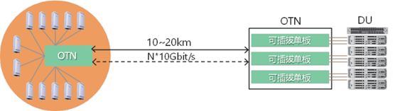 固网侧和无线侧之间可以通过光纤进行传递,远距离传递主要是有波分产品来承担,波分产品主要是通过WDM+SDH的升级版来实现对大量信号的承载,OTN是一种信号封装协议,通过这种信号封装可以更好的在波分系统中传递。