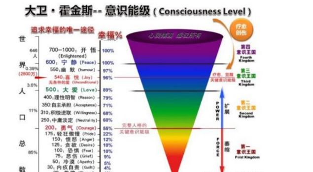 美国著名大卫·霍金斯博士(David R. Hawkins, Power vs. Force)与诺贝尔物理学奖获得者合作,经过近三十年长期的临床实验,其随机选择的测试对象横跨美国、加拿大、墨西哥、南美、北欧等多地,包括各种不同的种族、文化、行业、年龄等多元性指标,累积了几千人次和几百万笔数据资料,经过精密的统计分析之后,发现人类各种不同的意识层次都有其相对应的能量振动频率物理学指数。