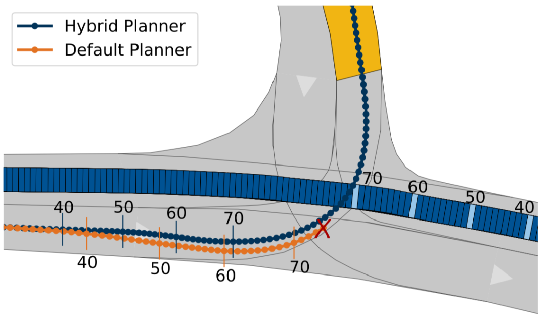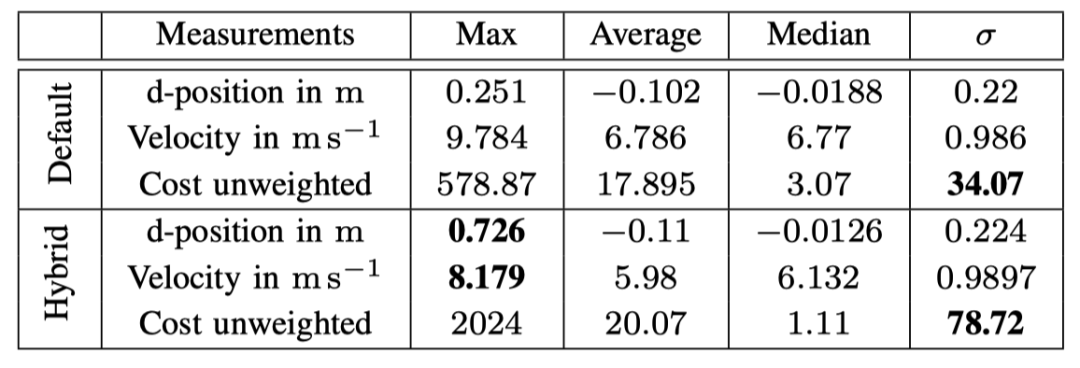 结果表明,混合方法是有效的,并且可以显著改善分析模型,同时缩短执行时间。与其他纯RL模型相比,该模型的训练过程很快,成功率很高。通用性显著提高。虽然纯分析模型在某些情况下表现相对较好,但性能可能因情况而异。此外,通过正确的设置,所提出的模型可以补偿其他模型(例如预测算法)的误差。然而,对算法的重大修改需要对代理模型进行部分重新训练。该方法的设计也可以进行调整和增强。因此,方程(2)中的极限经常被利用,这表明该模型可以得到改进。此外,必须仔细考虑奖励值和场景的选择,这可能很耗时。总体而言,作者的概念展示了混合规划器提供的协同作用的有效利用,并通过更高的复杂性和在边缘场景中的适用性扩展了当前可用的方法
