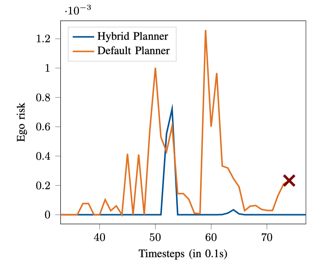 图8显示了场景中主动自我风险的降低。可以看出,在作者的模型中,风险总额明显较低。理论上计算的风险不一定反映碰撞的发生。然而,模型可以避免碰撞,并将计算出的潜在危害风险最小化。对物体的错误预测会导致导致DP碰撞的行为。结果表明,这些可以通过模型进行补偿。