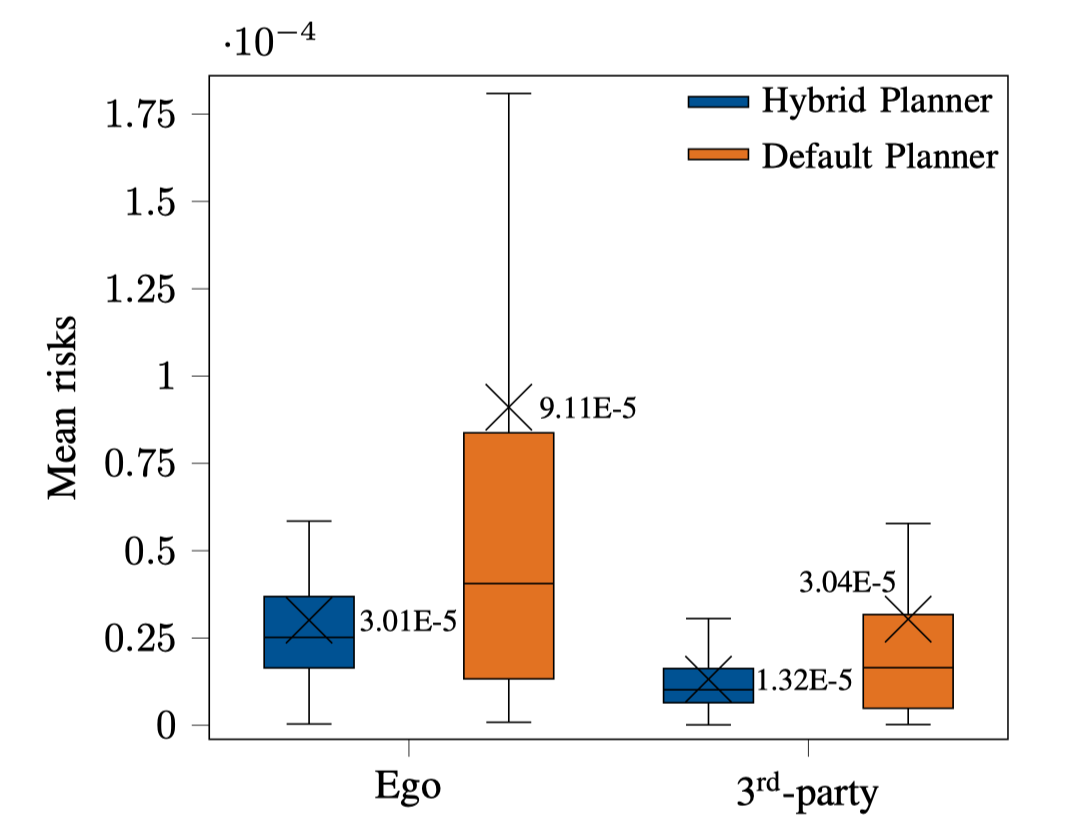 作者的评估涵盖了64种不同的场景来评估风险水平。通过计算所有场景的平均风险,作者获得了对整体安全状况的宝贵见解。值得注意的是,结果表明,自车和第三方道路使用者的风险降低,凸显了道路安全性的提高。图5显示了场景中的自车风险和第三方风险。蓝色表示HP,橙色表示DP。与DP相比,HP仅显示自车风险的33%左右。