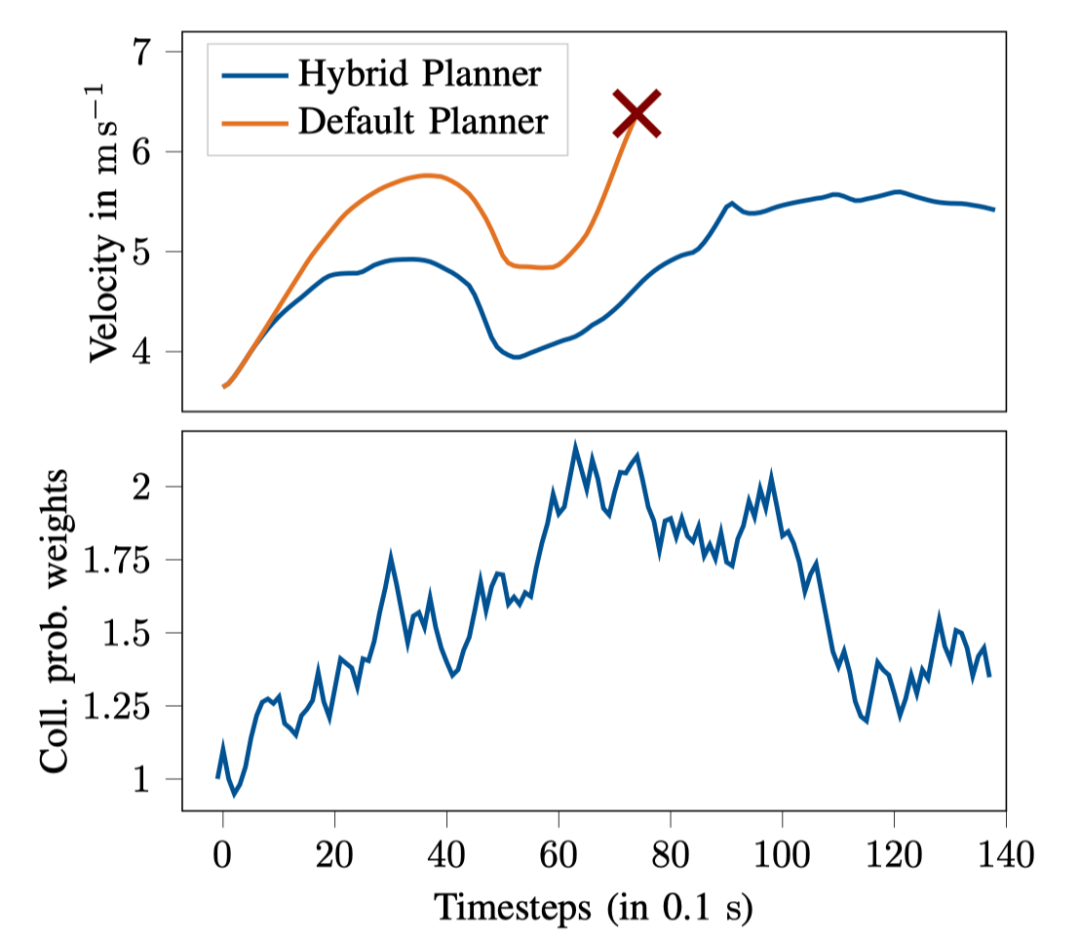 ▲图7|HP和DP的速度分布以及由于混合规划器的操作而导致的碰撞概率权重的相对变化©️【深蓝AI】编译
