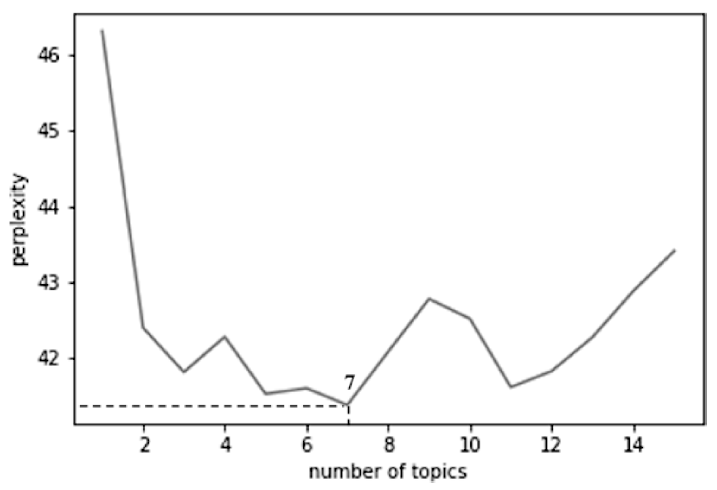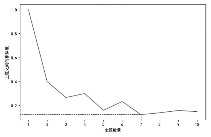 通过Python编写程序,设置最大主题数为15、步长为2来计算困惑度Perplexity得分。当主题个数为7时,困惑度Perplexity得分曲线和主题相似度曲线处于最低处(见图3和图4),因此基于困惑度Perplexity和主题相似度两种计算方法,所得到的最优主题个数为7个。