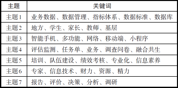 评估监测、任务单等5个主题词词频占全部词汇词频的15.8%,这反映了督导业务优化与一网通办的需求点内涵。根据问卷调研,智慧教育督导平台的业务使用基本聚焦于督政、督学和评估监测(在问卷调研对象中的占比分别为95%、86%和62%)。督导机构重组、义务教育普及和农村教育改革等历史为我国督导中督政、督学的结合提供了实践和理论本源(杨颖秀 等, 2005)。督政包括自上而下各级的督政,也包括各部门之间的横向督政。由此,督导任务单之间的流转显得尤为重要。在LDA数据结果中,“任务单”“业务”的词频分别为34次和30次。可见,地方需要将督政与督学过程中发现的问题以灵活快捷的任务单“一键触达”业务流转至各层级,以改善原有的各级业务线混杂、业务执行拖延的状况,实现业务的优化。另外,评估监测作为督导的重要手段,同时是督导三大业务之一(主题词词频占比62%),未来平台减少加入评估监测系统或功能也成为各地的需求(LDA主题词词频为57次)。