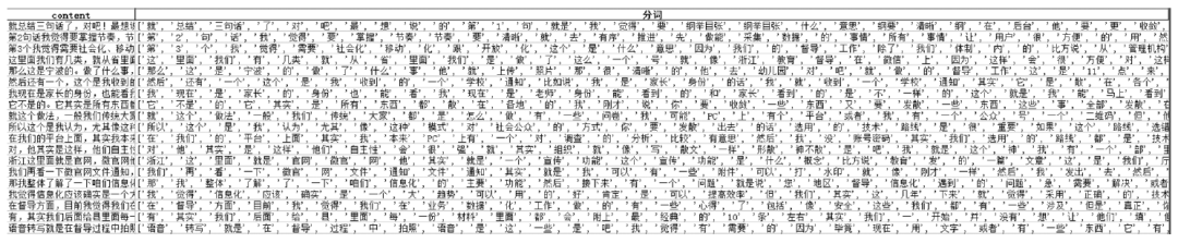 本文采用Python3.7的jieba分词包、re字符串处理包,通过自定义用户词典分词处理,筛查出错误词汇与无实际意义的词汇,形成停用词词典,最后去除停用词,对文本进行向量转换。具体转换步骤如下:第一,通过梳理《深化教育督导改革转变教育管理方式的意见》《关于加强教育督导与评估工作的意见》等51份政策文件,筛选出教育督导相关的专业性词汇,如“优质均衡”“教育职责”“基础教育”“学前教育”等,丰富自定义用户词典;第二,通过jieba分词包,对原始访谈文档进行分词处理(如图2所示),并从中筛查出错误分词的词汇,将错分词汇整合后添加至自定义用户词典中,以便计算机识别;第三,根据分词处理后的结果数据,筛选出语气词、虚词、助词、人名等一些无实际意义的词,如“个人建议”“总结”“举个例子”“陈处长”等,形成中文停用词词典,提高访谈文档与智慧教育督导的相关性;第四,使用Python中CountVectorizer函数对去除停用词后的文本进行向量转换,转为LDA模型分析所使用的向量模式。