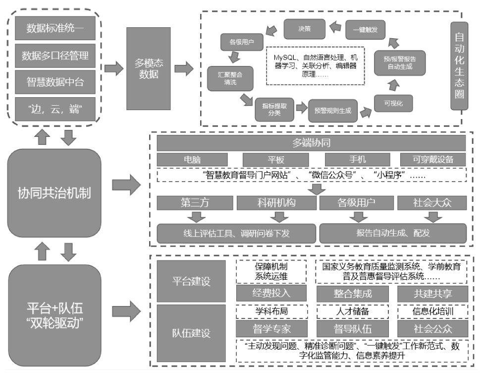 督导的智慧化进阶,本质上是基于数据的深度运用。在图7中,平台建设以数据为驱动,面向全域督导干系人的“分层分类服务”,实行统一数据标准与多接口管理,将“协同共治机制”下的多方数据汇聚至涵盖各级用户、指标模型库、算法库以及可视化引擎、触发与决策机制在内的数据自动化生态圈中。发挥多端协同和数据自动化生态的作用,让各级人员实现常态化调研、提交数据、预警报警与报告获取,逐步实现“问督于民”与“全过程智治”。“平台+队伍”双轮驱动是平台可持续发展的基础,一方面依靠稳定的经费投入保障系统运维,并在“协同共治机制”下,根据实际需求对不同业务、区域、层级下的子系统进行集成,实现全方位的共建共享;另一方面要依靠教育测量与评价、教育大数据等学科布局和信息化培训,做好督导人才储备以及信息化素养提升工作,夯实智慧督导发展的基础。
