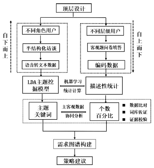 为了明确我国智慧督导发展的方向和重点,课题组基于国家智慧教育督导平台的建设实践,从问卷客观数据结果、主观访谈诉求表达切入,采用调研问卷数据分析和访谈文本LDA主题算法挖掘两种方法,对两种模态的数据进行深入挖掘,以求更全面地反映地方需求。研究设计思路如图1所示。