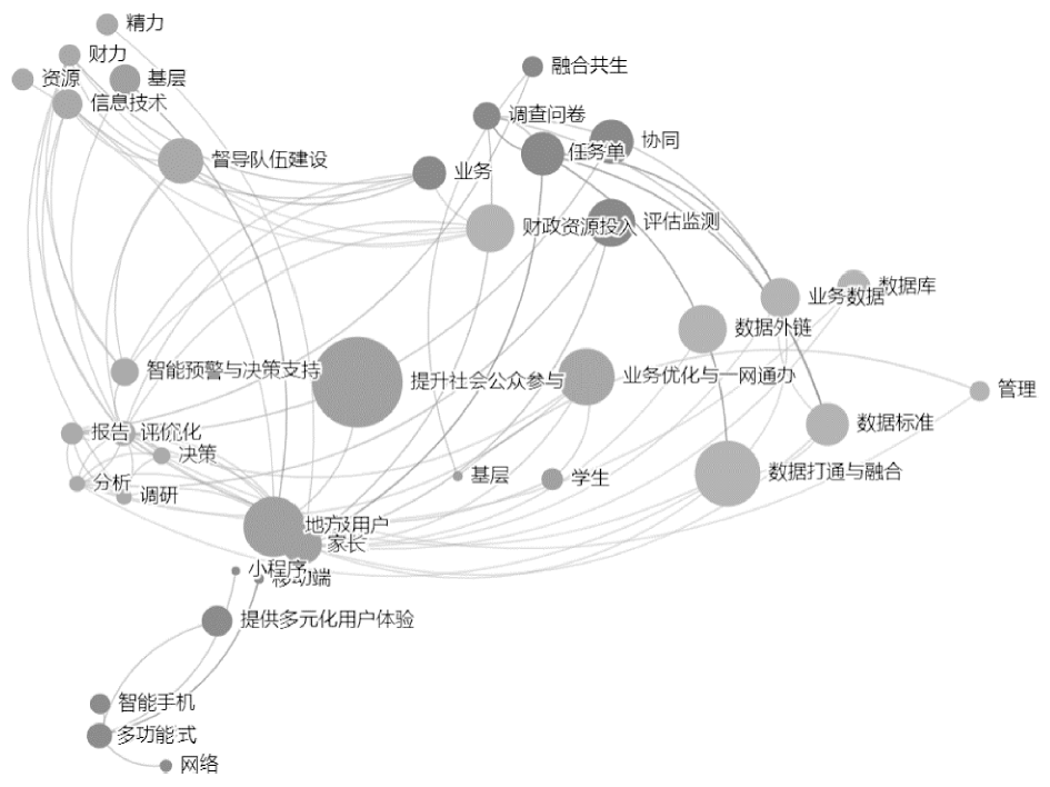 然而,在国家教育数字化战略行动的快节奏进程中,由于“国家智慧教育督导平台”Ⅰ期的建设和上线周期较紧,本研究也存在一些局限。本文构建的需求图谱仅为静态图谱,未充分考虑督导业务在数字化进程中的转型升级而引发用户需求的动态变化。后续在国家智慧教育督导平台上线实施中,团队将持续以“应用为王”理念,改进需求识别与提取算法,且行且思、且建且用,通过发挥平台自身优势,创建“常态化需求调研”任务流程,纳入智慧教育督导工具集,周期性地获取各级各类用户需求和体验的相关数据;在大数据分析技术方面不断加强人工智能技术赋能,如加入Word2Vec模型,加强对主题词间关系的刻画,并以此为数据基础进行主题自适应聚类;结合支持向量机、朴素贝叶斯等方法,智能挖掘高价值需求信息,刻画更全面的需求特征库,从而形成全周期、动态性的应用需求立体综合画像,用以指导平台的持续升级迭代,为国家教育督导向智慧督导进阶奠定良好的决策支持基础。