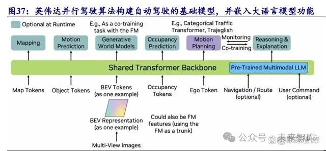 更进一步,自动驾驶有望逐步从数据驱动迈向认知驱动。前文提到驾驶或许需 要“系统一”和“系统二”的结合,在自动驾驶中,神经网络天生就像系统一,暴 力计算一个近似的函数来执行;而大语言模型拥有海量参数,并广泛的学习人类世 界知识,具有较强的认知水平,其所具备思维链能力可以通过提示词一步步完成复 杂任务,类似系统二。在未来,大语言模型有望和端到端基础模型结合,形成类似 系统一和系统二的功能共同赋能自动驾驶。理想汽车和清华联合推出的 DriveVLM、 以及英伟达在 GTC 大会上所提到的基础模型都有类似的设想和思考。其中英伟达 自动驾驶汽车研究总监 Marco Pavone 在 GTC 大会上的演讲提到,视觉基础模型和 大语言模型正在成为自动驾驶领域两个尤为重要的基础模型,通过两者的有机结合, 可以让两个方案相互之间扬长避短,在他提到的“并行驾驶”的算法架构中,大语 言模型可以被嵌入其中,作为导航规划器或者监视器来处理复杂场景。在其另一项 研究中自动驾驶算法采用了快-慢推理的流水线,可以看到当遇到带有停止标志 (Stop sign)的广告牌场景时,大语言模型帮助很好的识别了广告牌上的停止标志 (Stop sign),避免了幽灵刹车情况的出现。