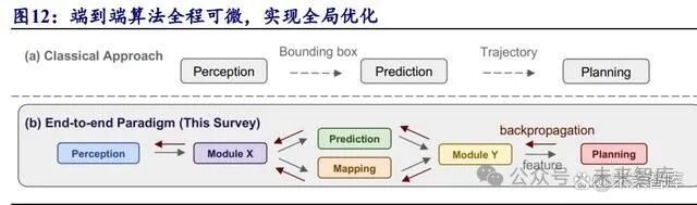 在模块化算法中,每个模块都以人类工程师定义的目标进行优化,各个部分分 而治之,可能出现局部最优但整体效果差的情况,如目标检测的指标是平均精度 (mAP),规控算法的检测指标要考虑碰撞率、任务完成率等。端到端自动驾驶则 对整个自动驾驶流程进行优化,神经网络的链式法则可以从输出端(控制)向输入 端(感知)贯通,输出结果可以将误差依次反向传播给所有模块,以最小化整体损失函数为目标,更加准确地更新每个网络层中的参数,以使体验达到最优状态。 (好比考试的时候,答案中 ABCD 的占比是一样的,但如果不通篇看题目,会丢掉 这一重要的全局信息)在特斯拉 FSDV12 版本的视频中,有些时候会出现规控算法 不会完全按照感知呈现的结果执行驾驶行为,或许亦体现了全局优化的优势(规控 会根据自己的经验忽略掉一些感知出现的问题如误检等)。