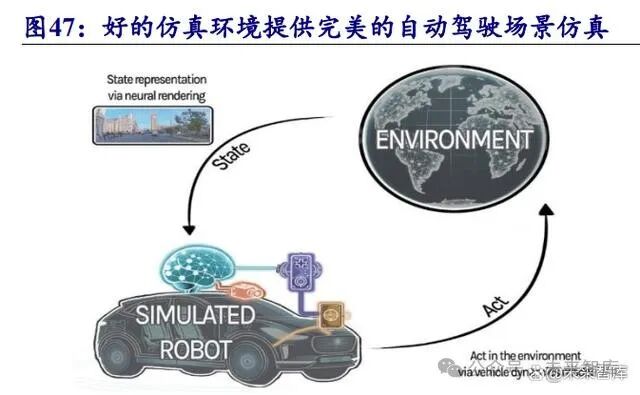 Nerf、3DGaussion、视频生成等技术不断迭代,生成式 AI 各显神通助力自驾 仿真。目前,合成数据已经被广泛应用在自动驾驶行业,目前主要形成三大路线: 物理仿真与图形渲染、基于神经辐射场(Nerf、3D Gaussion 等)、和基于世界模型 的路线。其中早年的仿真主要依赖物理仿真模型再叠加游戏引擎等工具进行渲染, 这类方案的问题在于想达到较强的真实感门槛较高,且需要建模大量的高质量资产, 优点在于可编辑性、可控性较强。近年,神经辐射场(Nerf)走上台前,其可以将 2D 图片清晰、逼真的还原为 3D 场景,效果精美吸引了无数人关注,随后 3D 高斯 横空出世,更优的计算效率让其在用户中广泛使用。由于 Nerf 和 3DGaussion 都是 将平面图像进行立体还原,无法“凭空”生成场景,因此多采用三维重建+场景编 辑的方式解决仿真问题,但泛化性仍然有限。而随着 Sora 等模型的诞生,视频生成 未来有望进一步助力自驾行业腾飞。