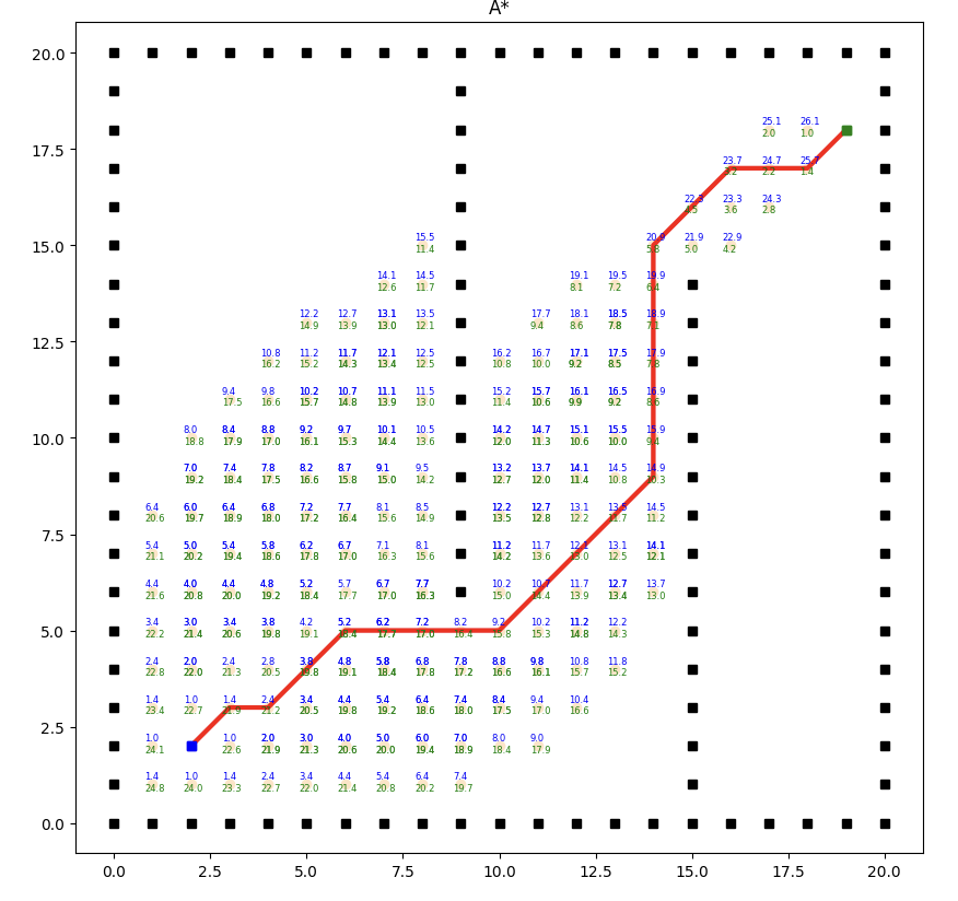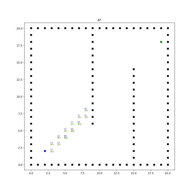 def searching(self): self.PARENT[self.s_start] = self.s_start # 开始节点的父节点 self.h[self.s_start] = math.inf # 开始节点的成本 self.h[self.s_goal] = math.inf # 目标节点的成本 heapq.heappush(self.OPEN, (self.heuristic(self.s_start), self.s_start)) while self.OPEN: # 当不为空时,即存在未探索区域 _, s = heapq.heappop(self.OPEN) # 弹出最小的元素,优先级较高 self.CLOSED.append(s) # 将节点加入被访问元素队列 if s == self.s_goal: break for s_n in self.get_neighbor(s): # 得到s的邻居节点 new_cost = self.heuristic(s_n) + self.cost(s, s_n) # 计算当时邻居节点s_n的成本=g(s)节点s的成本+s到s_n之间的成本 if s_n not in self.h: # 下一个节点没有遍历过 self.h[s_n] = math.inf # 起点到节点s_n的成本为无穷 if new_cost < self.h[s_n]: # 预估节点s_n成本<g(s_n)从起始节点到节点s_n的成本 self.h[s_n] = new_cost # 更新成本函数 self.PARENT[s_n] = s # s_n的父节点为s heapq.heappush(self.OPEN, (self.heuristic(s_n), s_n)) # 把成本h放入堆栈 self.h[s_n] = self.heuristic(s_n) return self.extract_path(self.PARENT), self.CLOSED, self.h