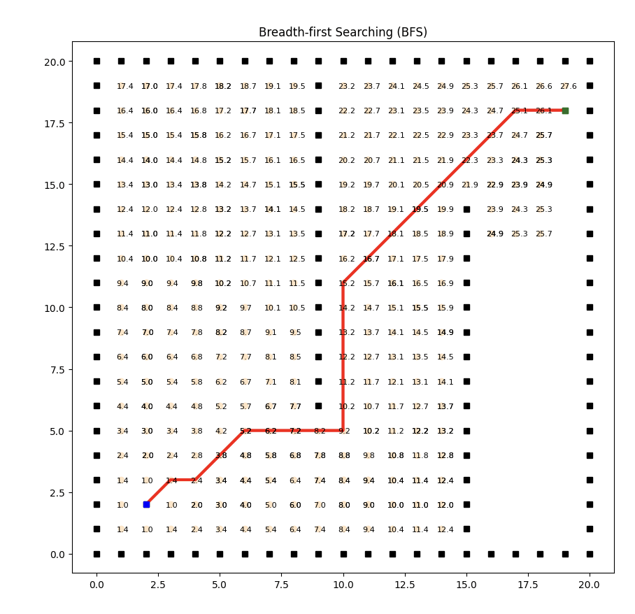 def searching(self): ”“” Breadth-first Searching. :return: path, visited order ”“” self.PARENT[self.s_start] = self.s_start # 开始节点的父节点 self.g[self.s_start] = 0 # 开始节点的成本 self.g[self.s_goal] = math.inf # 目标节点的成本 # 统一成本搜索,起点的成本是0 heapq.heappush(self.OPEN, (0, self.s_start)) while self.OPEN: _, s = heapq.heappop(self.OPEN) # 弹出最小的元素,优先级较高 self.CLOSED.append(s) # 将节点加入被访问元素队列,已访问 if s == self.s_goal: # 到达目标点,即停止 break for s_n in self.get_neighbor(s): # 得到s的邻居节点 new_cost = self.g[s] + self.cost(s, s_n) # 计算当前邻居节点s_n的成本=g(s)节点s的成本+s到s_n之间的成本 if s_n not in self.g: # 当前节点没有访问过 self.g[s_n] = math.inf # 起点到节点s_n的成本为无穷 if new_cost < self.g[s_n]: self.g[s_n] = new_cost self.PARENT[s_n] = s # 将新的节点添加到队列的末尾 prior = self.OPEN[-1][0] + 1 if len(self.OPEN) > 0 else 0 heapq.heappush(self.OPEN, (prior, s_n)) self.f[s_n] = prior return self.extractpath(self.PARENT), self.CLOSED, self.f