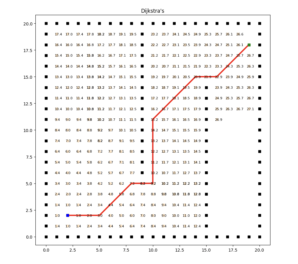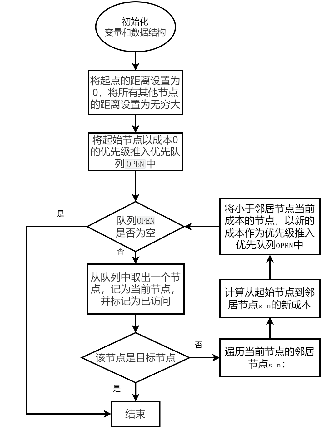 - 如果计算得到的距离值小于邻居节点的当前距离值,则更新邻居节点的距离值为新的更小值并将邻居节点s_n以新的成本作为优先级推入优先队列OPEN中循环结束后,可以通过从目标节点回溯到起始节点,在PARENT字典中提取最短路径。