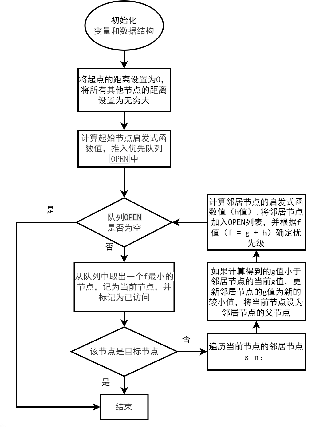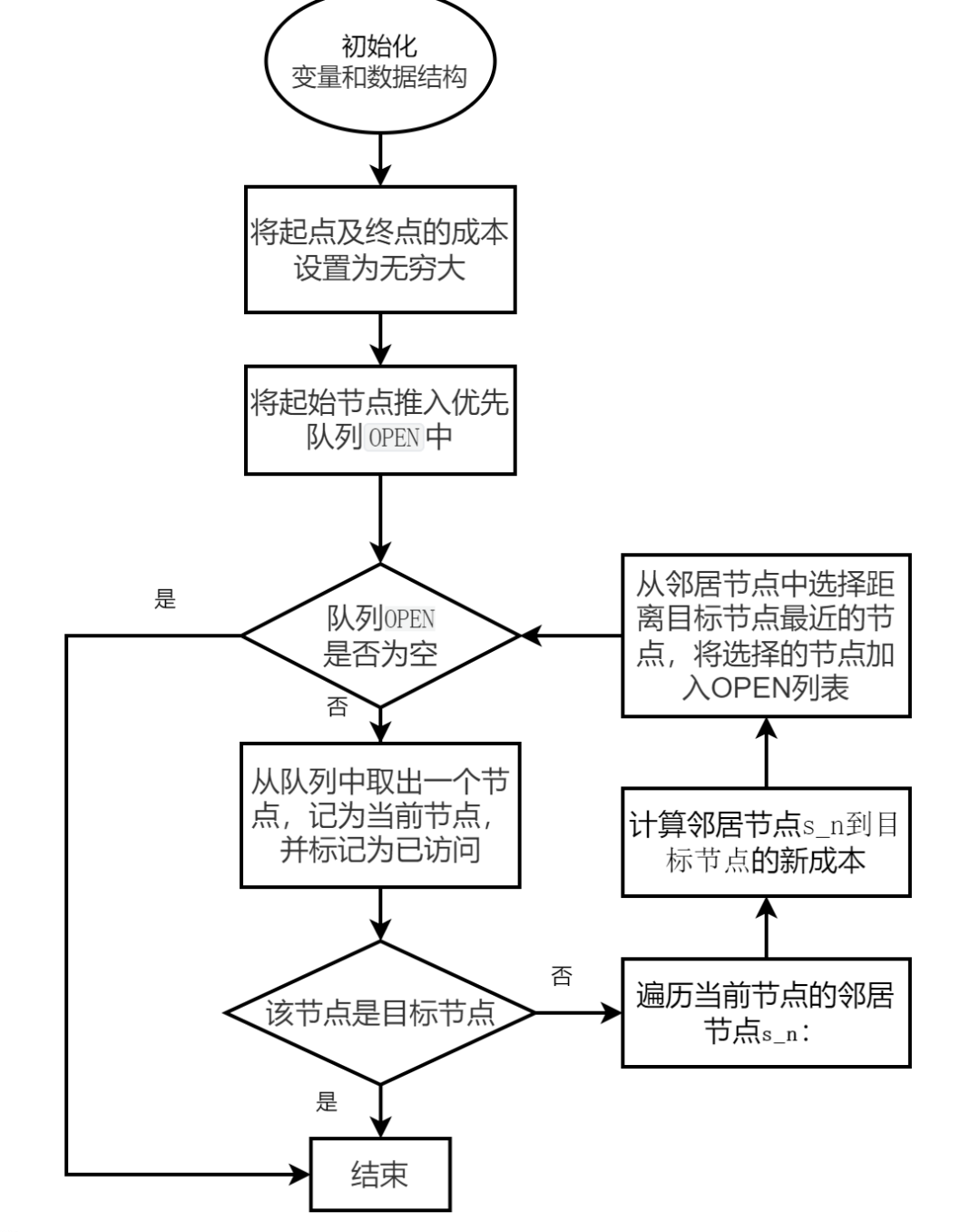 - 获取当前节点的邻居节点,从邻居节点中选择距离目标节点最近的节点,将选择的节点加入OPEN列表,并将该节点作为当前节点。