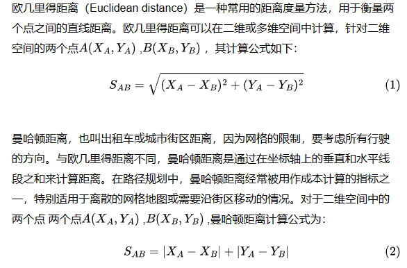 在路径规划中,成本计算的一个主要因素是距离。距离可以作为一种衡量路径长短的度量指标,通常使用欧几里得距离、曼哈顿距离或其他合适的距离度量方法来计算。
