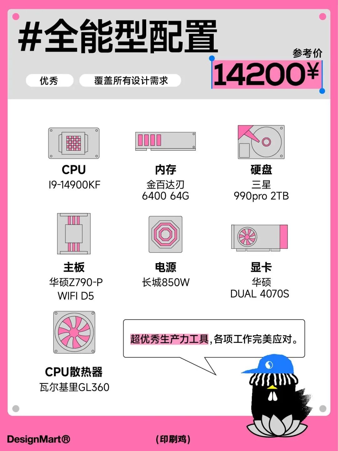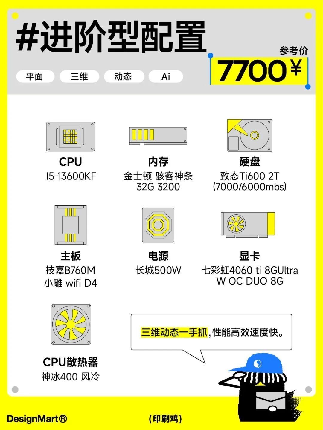 AI时代,能够同时驾驭AI工具、三维软件和动静态设计工具的电脑配置,需要满足哪些条件?这里@设计便利店 给出了基础、中、高级电脑配置清单,价格从4000到1w+,功能从入门(轻度生产力)到全能(AI渲染、三维建模),方便大家直接抄作业。