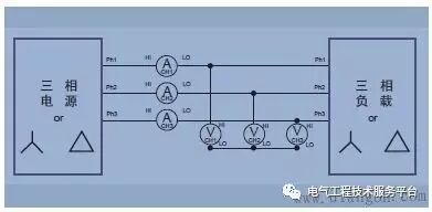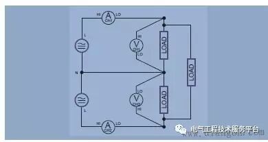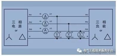 测量四线系统中的总功率要求三个功率表。测得的电压是真实的相电压。通过使用矢量数学运算,可以从相电压的幅度和相位中准确地计算出相间电压。现代电源分析仪也使用基尔霍尔定律,计算流过中线的电流。