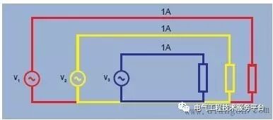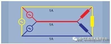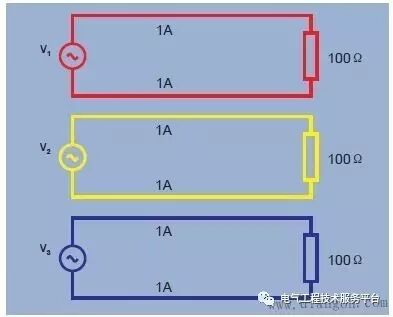 我们看看三个单相系统,每个系统为一个负载提供100W的功率(图3)。总负载是3 x 100W = 300W.为提供电力,1安培电流流经6根线,因此有6个单位的损耗。也可以把三个电源连接到一个公共回程上,如图4所示。当每个相位中的负载电流相同时,负载被认为是均衡的。在负载均衡、且三个电流相位彼此位移120°的情况下,任何时点上的电流之和都为零,回程线路中没有电流。