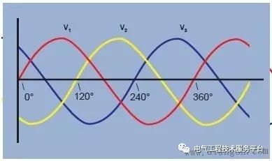 三相电由频率相同、幅度类似的三个AC电压组成。每个ac电压“相位”与另一个ac电压相隔120°(图1)。这可以通过图形方式,使用波形和矢量图(图2)进行表示。
