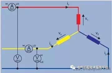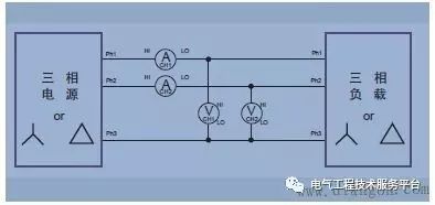 在有三根线时,要求两个功率表测量总功率。根据图所示方法连接两相到功率表的电压端子。