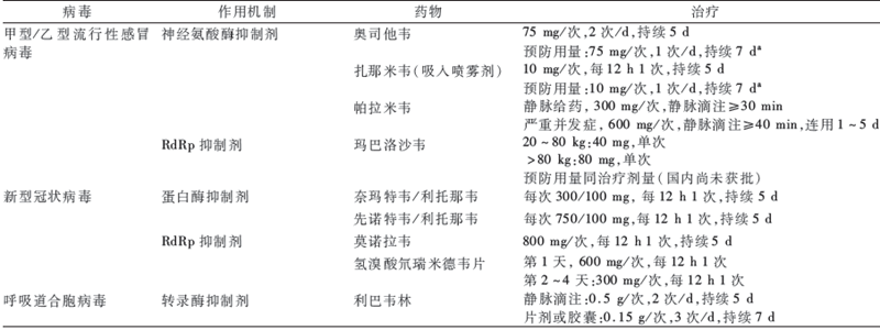 ① 建议确诊流感病毒感染患者早期(48 h内)进行抗病毒治疗,神经氨酸酶抑制剂和病毒RNA 聚合酶抑制剂对目前流行的甲型和乙型流感病毒具有良好的效果和安全性,根据患者情况选择合适的抗病毒药物。