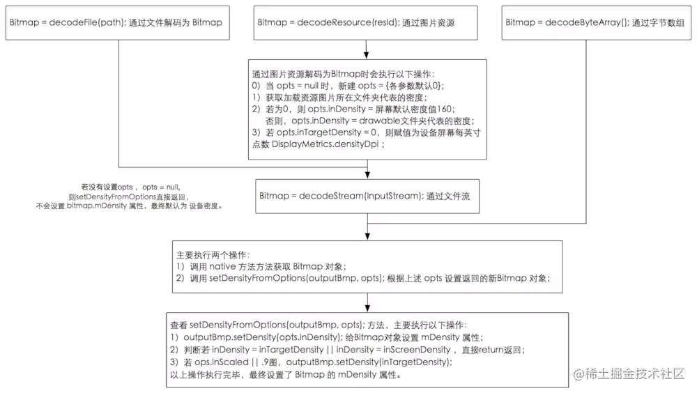 Bitmap 类的构造方法都是私有的,所以开发者不能直接 new 出一个 Bitmap 对象,只能通过 BitmapFactory 类的各种静态方法来实例化一个 Bitmap。仔细查看 BitmapFactory 的源代码可以看到,生成 Bitmap 对象最终都是通过 JNI 调用方式实现的。所以,加载 Bitmap 到内存里以后,是包含两部分内存区域的。简单的说,一部分是Java 部分的,一部分是 C 部分的。这个 Bitmap 对象是由 Java 部分分配的,不用的时候系统就会自动回收了,但是那个对应的 C 可用的内存区域,虚拟机是不能直接回收的,这个只能调用底层的功能释放。所以需要调用 recycle() 方法来释放 C 部分的内存。从 Bitmap 类的源代码也可以看到,recycle() 方法里也的确是调用了 JNI 方法了的。