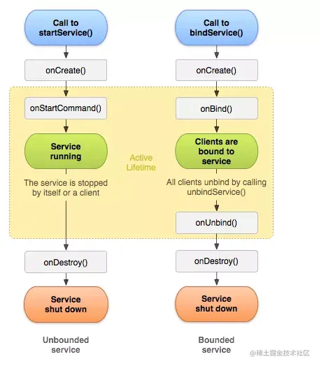 Service 分为两种工作状态,一种是启动状态,主要用于执行后台计算;另一种是绑定状态,主要用于其他组件和 Service 的交互。