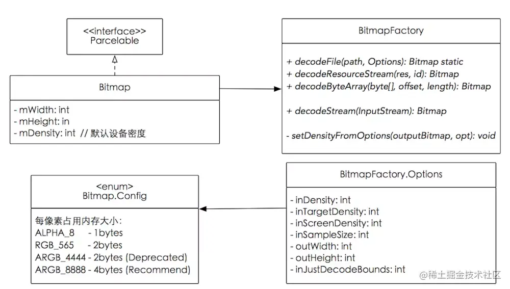 通常我们优化 Bitmap 时,当需要做性能优化或者防止 OOM,我们通常会使用 Bitmap.Config.RGB_565 这个配置,因为 Bitmap.Config.ALPHA_8 只有透明度,显示一般图片没有意义,Bitmap.Config.ARGB_4444 显示图片不清楚, Bitmap.Config.ARGB_8888 占用内存最多。