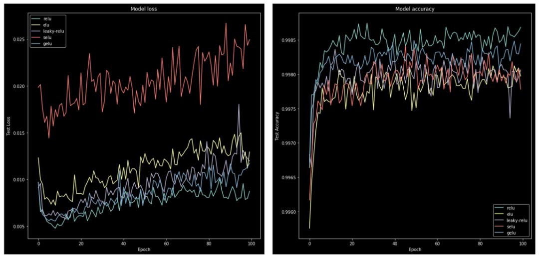- 使用每个激活函数的历史记录,绘制损失和准确度随 epoch 的变化图。