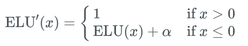 看起来很简单。如果输入 x 大于 0,则 y 值输出为 1;如果输入 x 小于或等于 0,则输出是 ELU 函数(未微分)加上 α 值。
