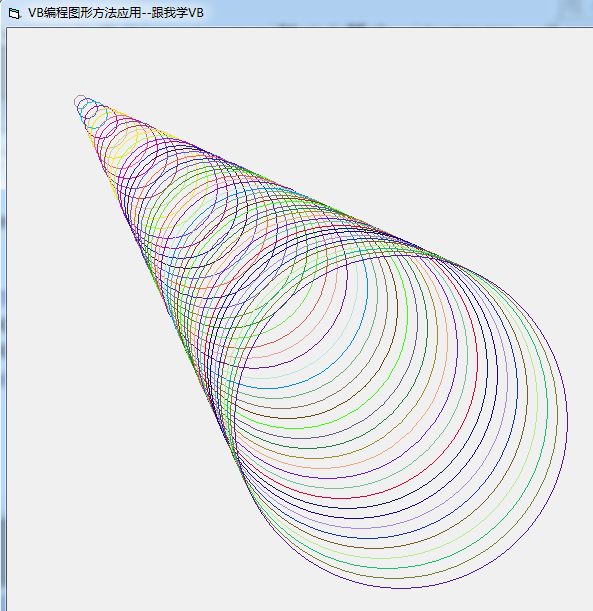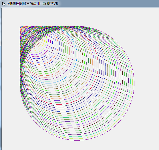 Option ExplicitDim x As Single, y As Single, r As Single ‘定义坐标x,y,半径r变量Private Sub Command1_Click() ‘VB编程生成图形x = 800 ‘指定起始坐标x值y = 800 ‘指定起始坐标y值For r = 100 To 2500 Step 50x = x + 100y = y + 100Circle (x, y), r, RGB(Rnd * 255, Rnd * 255, Rnd * 255) ‘调用Circle方法生成图形Next rEnd Sub