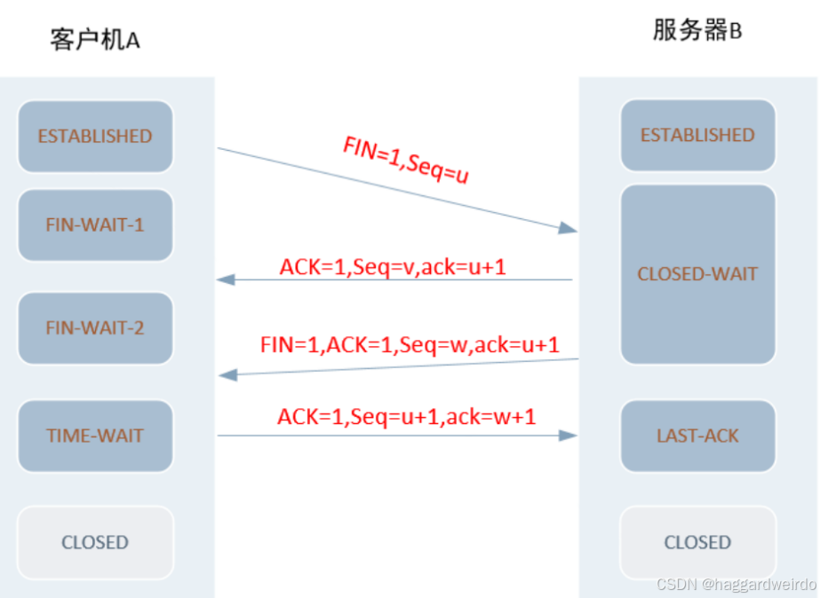- 客户机A端(主动连接端)收到FIN包后,发送一个ACK包,当服务器B端(被动连接端)收到ACK包后,四次断开动作完成,连接断开。