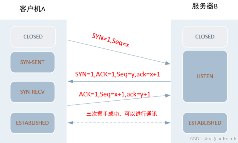 - 客户机A端(主动连接端)发送一个SYN包给服务器B端(被动连接端);