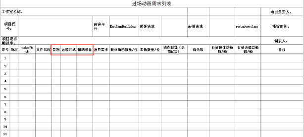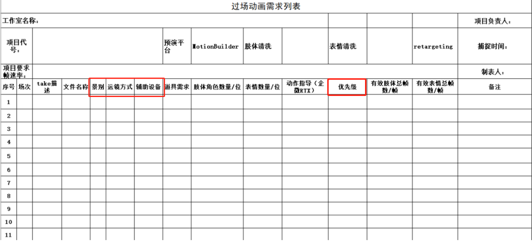 相比于影视拍摄通告,动捕拍摄表的功能就显得简单多了,它只是为了方便大家现场沟通,且有个参考依据。那么我们在现场捕捉的时候,到底哪些信息需要沟通呢?这几张表格,都是现场要沟通的内容。