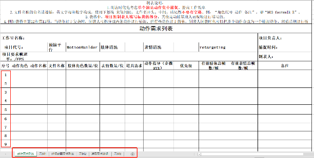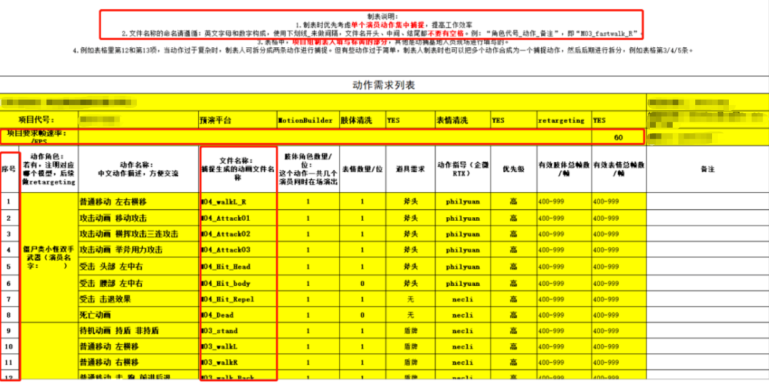 2.文件名称,这是动作捕捉必须要给到的;大家一定要看制表说明。需要提醒大家的是,因为大多数国外软件,是不能识别中文字符的,我们会把大家起的文件名称录入到我们动捕软件里,所以我们给文件起名的时候,一定要注意不要用数字开头,不要用空格断词,不要包含除了下划线以外的特殊字符。