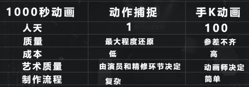 从表上可以看到,手K的优势就是,它的制作流程要比动作捕捉简单,我只需要投入一个人力、一台电脑就可以,但动作捕捉是需要配备一套过硬的设备和一支优良的团队来支撑的。