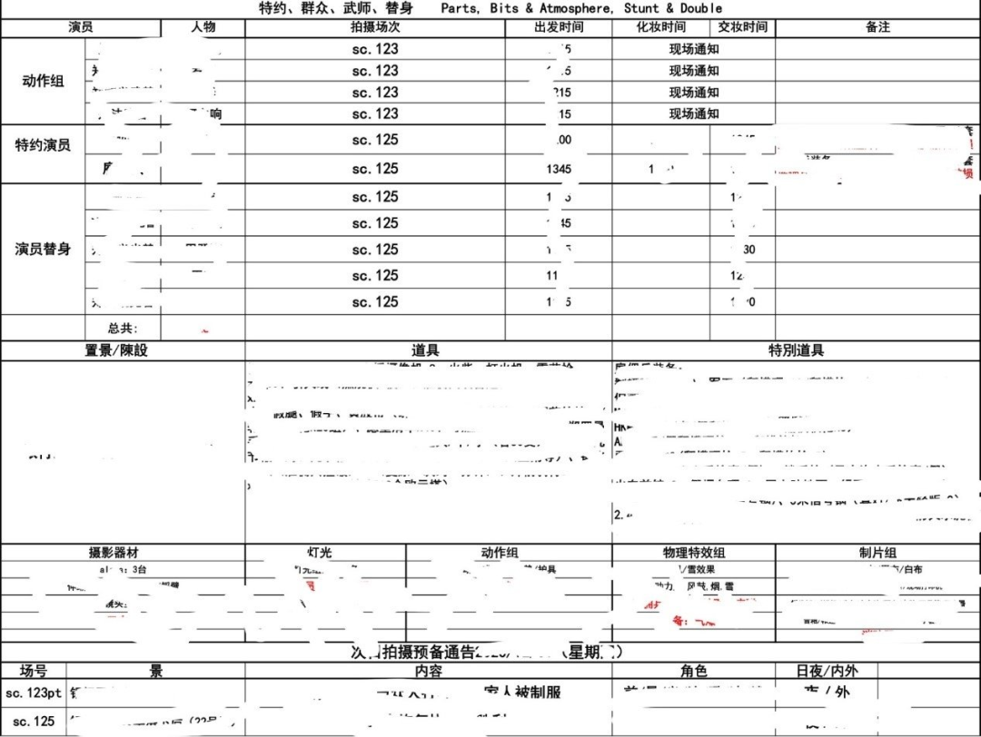 为什么非要强调表格的制作呢?接下来我给大家看一下影视拍摄中的表格制作,影视拍摄动不动就五十上百人,期间各个组各个角色要想保证工作的同时性,完全是按照这张表格来的。而且影响影视通告的因素有很多,比如特约演员的档期,拍摄的场地等等。而动作捕捉拍摄只是影视拍摄里面的一个拍摄场地,所以影视拍摄不一定能考虑到动捕拍摄的所有case。