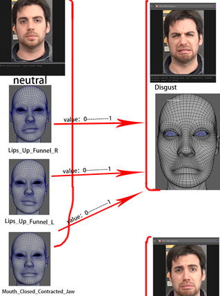 5. 如果有Blendshape,拆分时要注意尽量拆细,然后Blendshape之间的通道组合,尽可能用最少的morpher组合成尽可能多的我们所需要的表情。这时,你会发现facs真香。