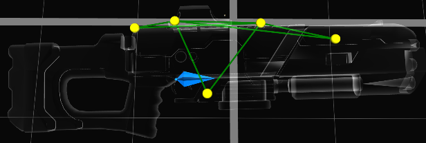 道具的捕捉,是基于我们的角色,并且跟动捕演员有极其接近的比例的基础上制作的,它的好处是,能自然地捕捉出武器的运动轨迹与质感。最好的道具捕捉就是,我们根据虚拟道具的尺寸大小,模拟出跟虚拟道具一样大小的实体道具来。它需要有明确的骨骼绑定,且有确切的骨骼朝向。上图是虚拟道具,以及骨骼绑定位置,下图是调整好的在动捕软件里的道具呈现