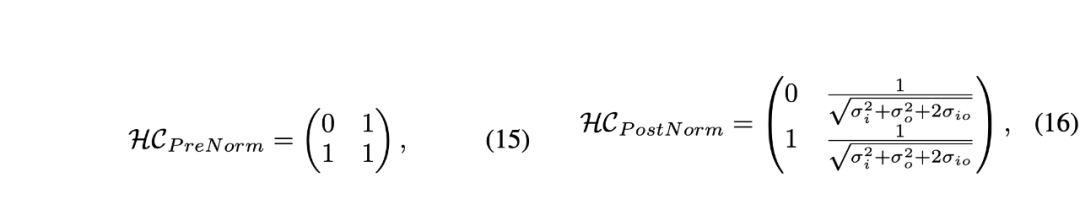 的矩阵,右下三角部分填充为 1,其余部分为占位符 0。 对于 Post-Norm,权重依赖于输入和输出的方差及协方差,形成一个