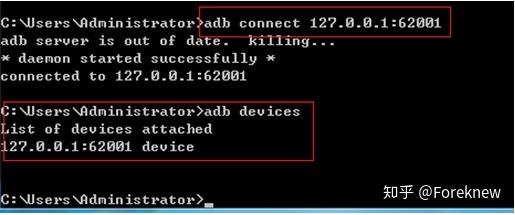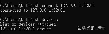 在DOS窗口中:adb connect 127.0.0.1:62001,再次输入adb devices,这时显示有设备连接上了